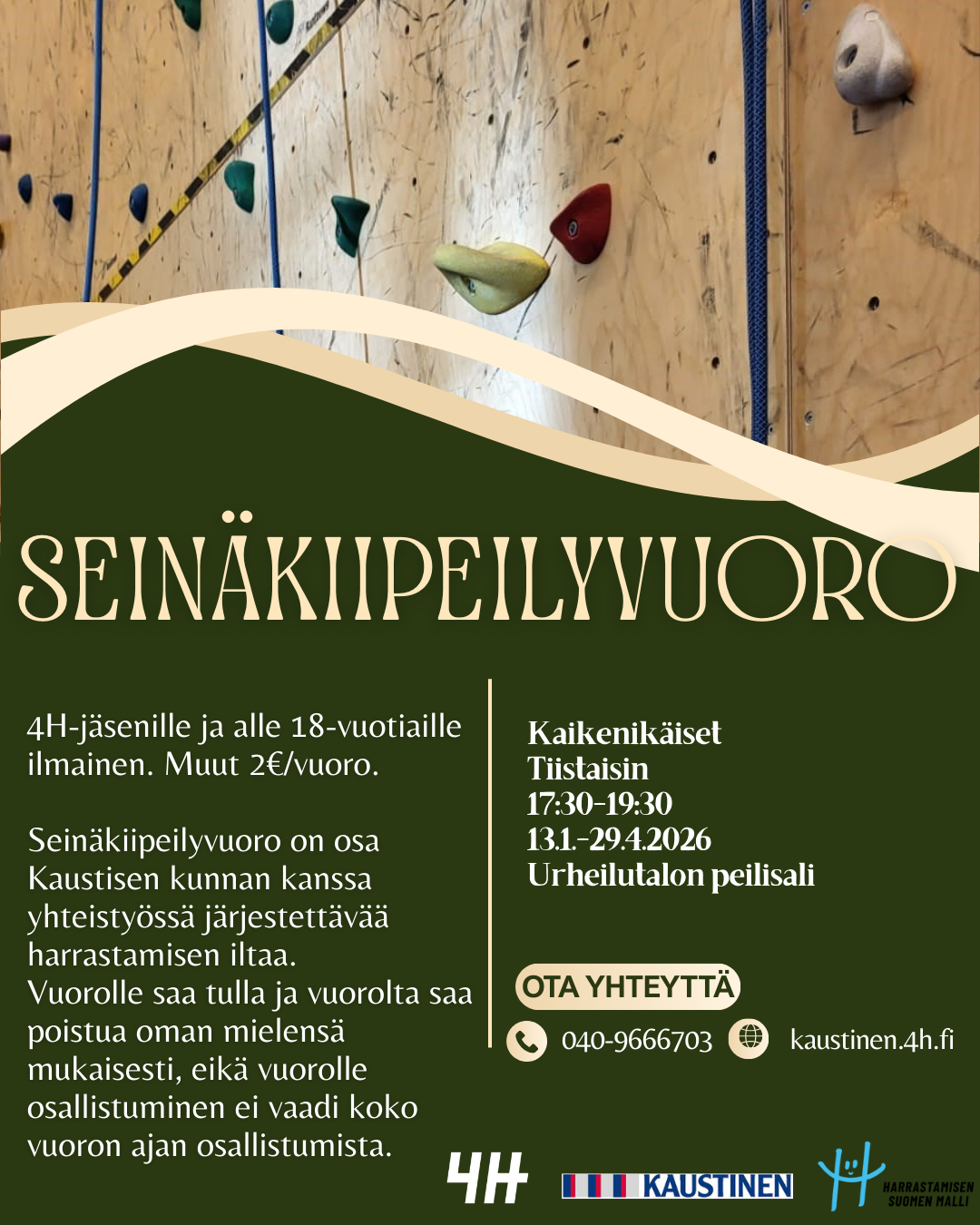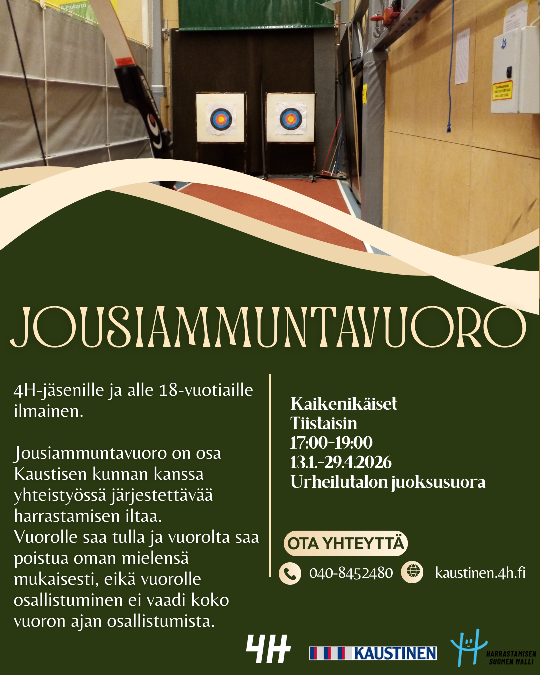 Seinäkiipeily- ja jousiammuntavuoromme ovat avoimia kaikenikäisille eikä vuoroille tullessa tarvitse omata aiempaa kokemusta, sillä paikalla on ohjaaja, joka auttaa sinut alkuun kädestä pitäen. Vuorot ovat osa Kaustisen kunnan kanssa yhteistyössä järjestettävää harrastamisen iltaa.