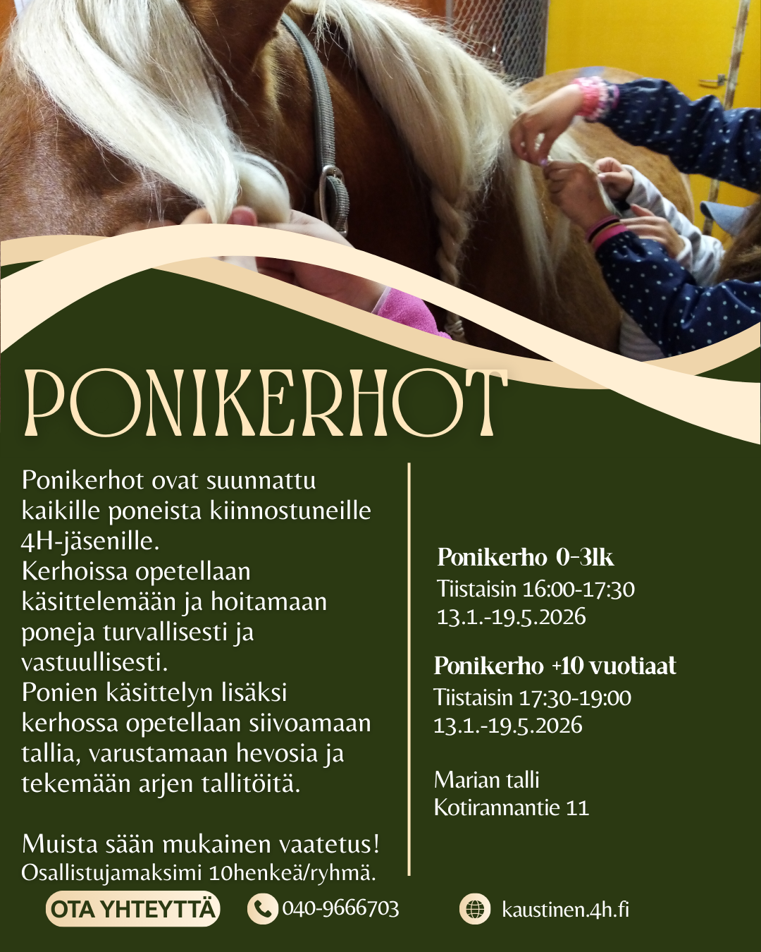 Osallistujamaksimi 10 henkeä/ryhmä. Huom! ennakkotiedosta poiketen ponikerhot starttaavat vasta 23.9. alkaen.
