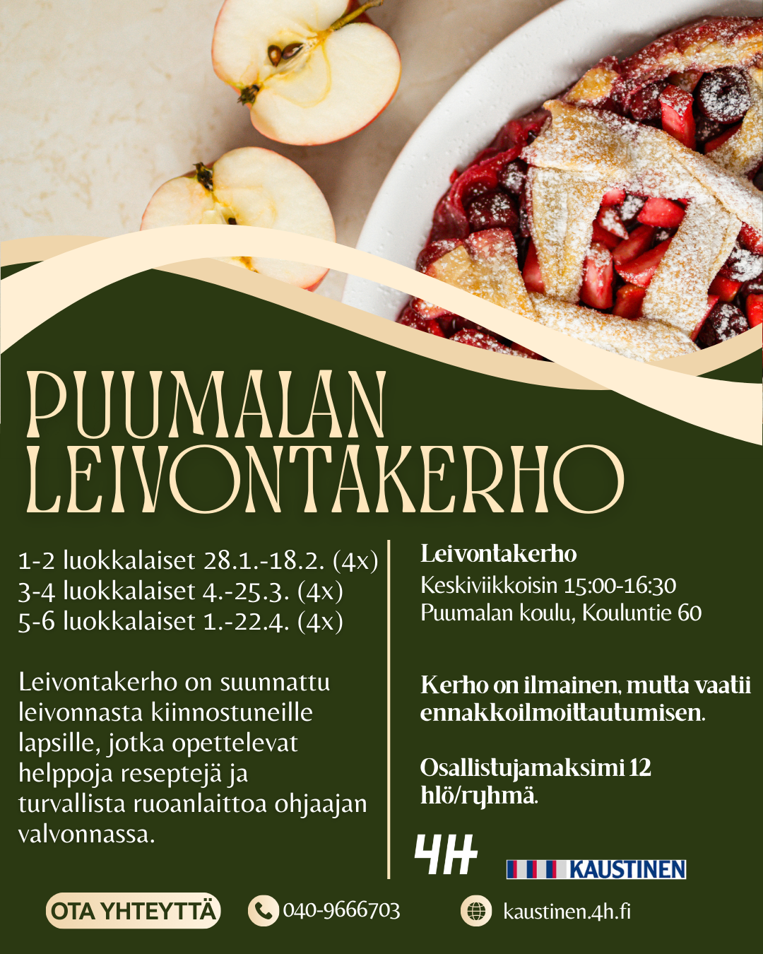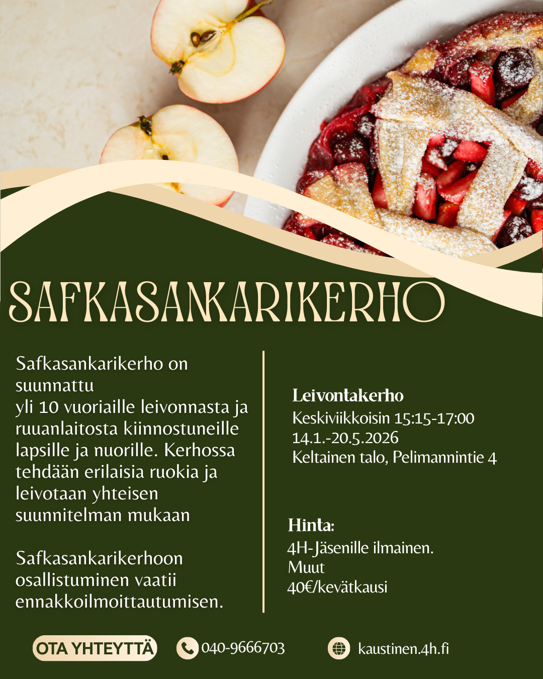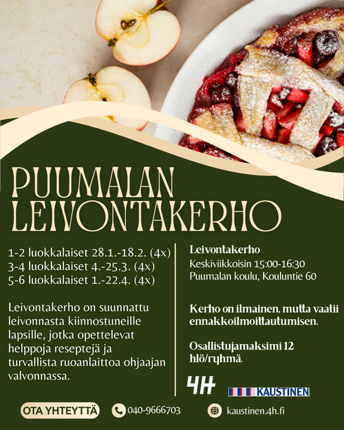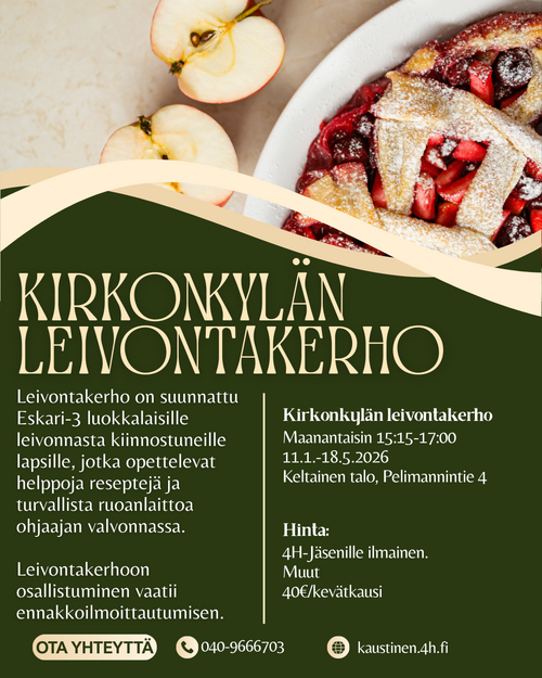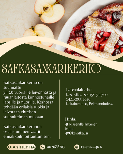 Leivontakerho ja Safkasankarit-kerho ovat suunnattu alakouluikäisille leivonnasta kiinnostuneille. Kerhoissa opetellaan leipomaan niin suolaisia kuin makeitakin herkkuja turvallisesti ja vastuullisesti ohjaajien valvonnassa.