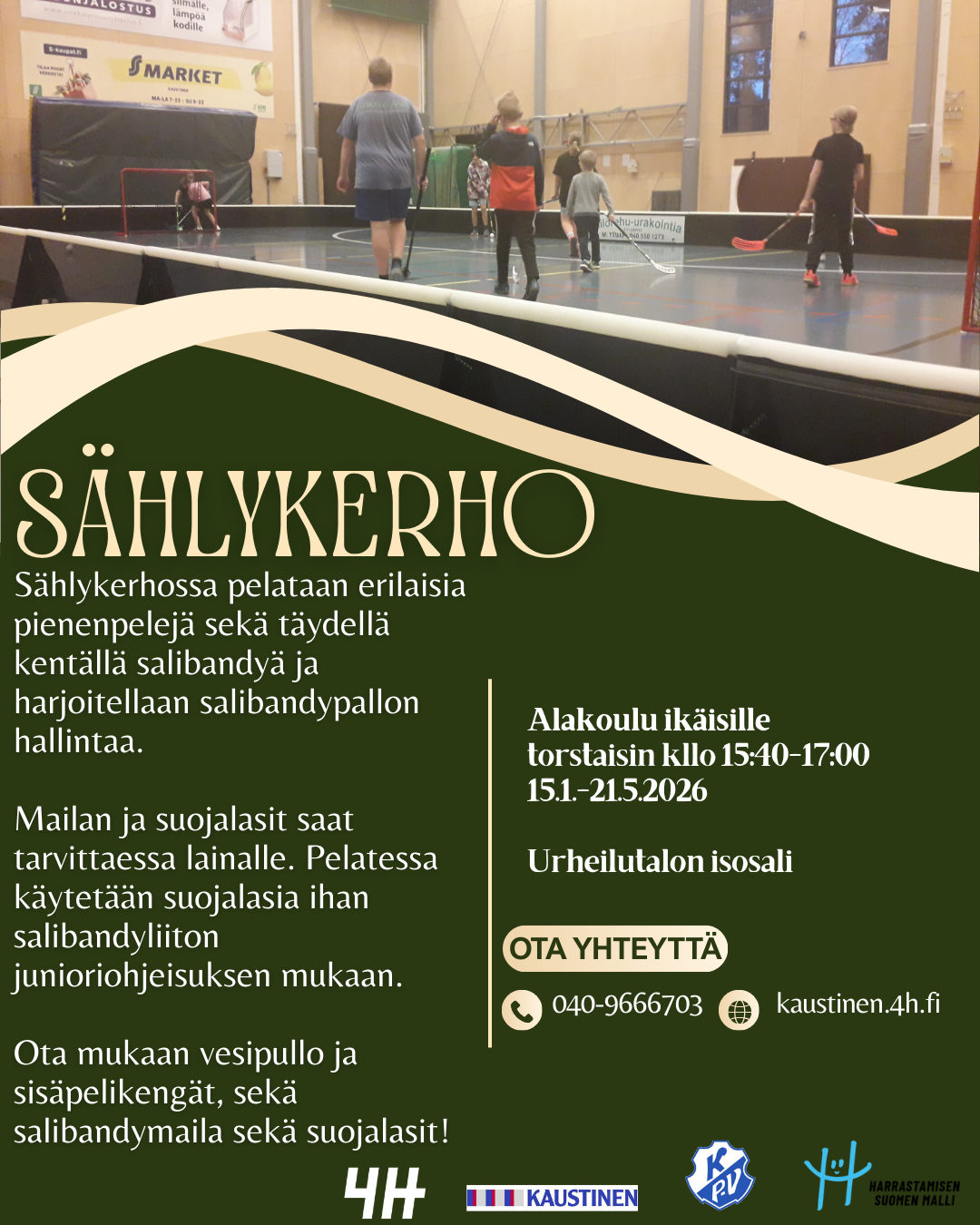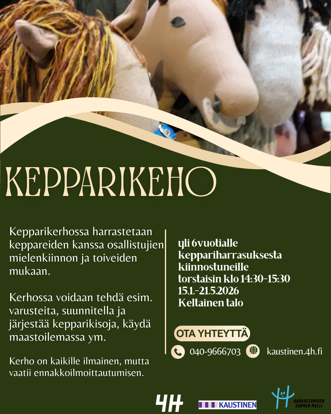 Järjestämme 4H-yleiskerhoja ja liikuntakerhoja, jotka ovat kaikille ilmaisia, eivätkä vaadi ilmoittautumista. Niihin tervetulleita ovat kaikki esikoulu- ja alakouluikäiset.
