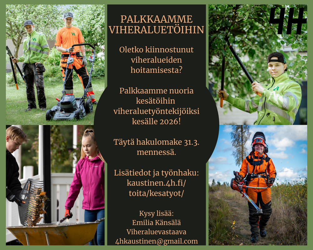 Palkkaamme viheralueiden hoitajaksi myös jo 18-vuotta täyttäneitä nuoria aikuisia. Ilmoitathan hakemuksessasi mikäli sinulla on käytössäsi peräkoukullinen auto jota voit hyödyntää koneiden kuljetuksessa asiakaskohteesta toiseen.
